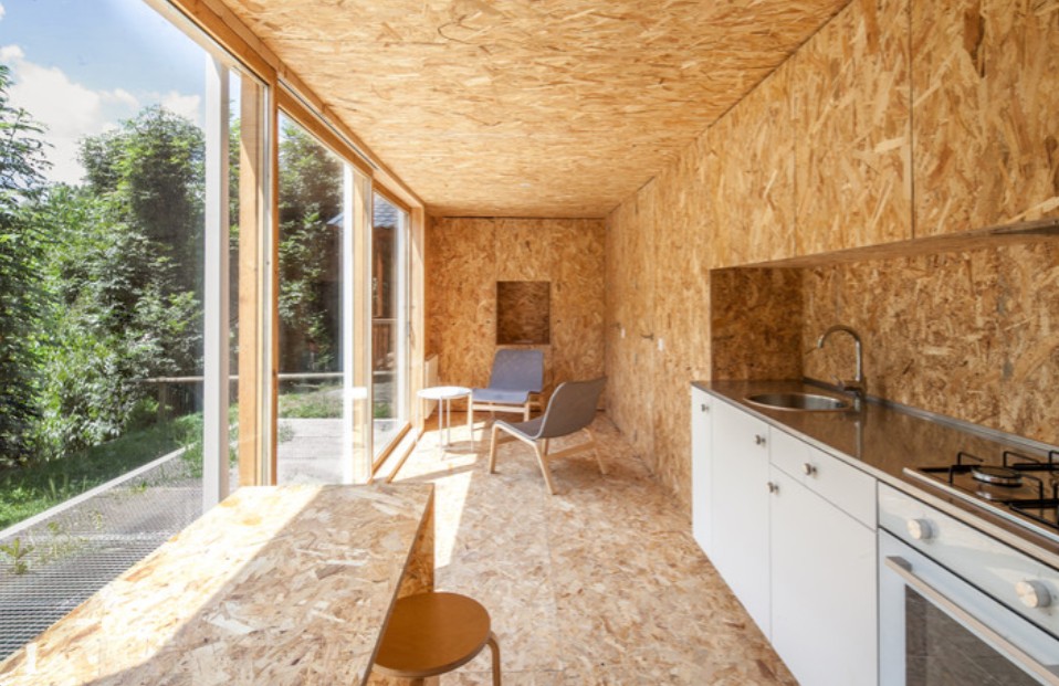 "Bu proje, çevreye daha az duyarlı olan kendin yap inşaatı ile ilgili yaygın uygulamaları gözden geçirmeyi amaçladı. Hafta için tasarlanmış bir kamp alanı.[...] Cephede mantar ve içte sunta kombinasyonu, sıkı termal ve ses yalıtımı. Malzeme bakım gerektirmez, sürdürülebilir ormancılıktan elde edilir, tamamen geri dönüştürülebilir ve termal köprülemeyi önler. Sürdürülebilir mimari projeye örnektir."