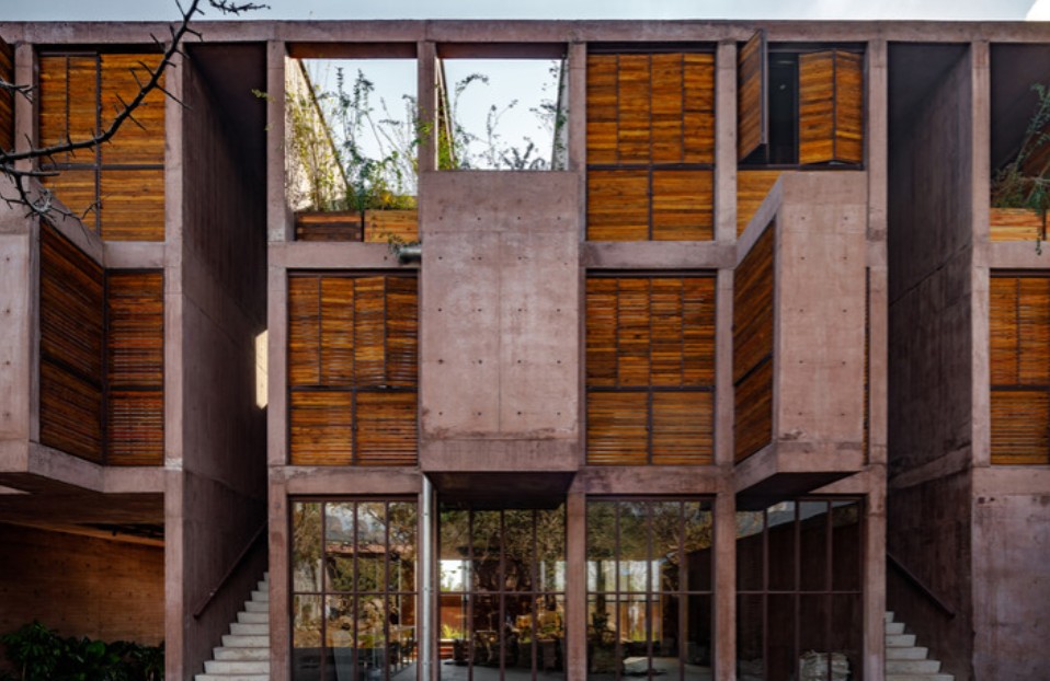 "Mimari ve doğanın kaynaşması ilk tasarım konseptinin merkezinde yer aldı. Bu nedenle sürdürülebilir yapı malzemeleri duvarların inşası ve yolların döşenmesi için mimarlar sahada bulunan taş kullanmaya karar verdiler. Yapı, doğal pigmentasyonlu brüt betondan yapılmış. Manzaranın renklerine ve Tepozteco Vadisi'ni çevreleyen tepelerin kırmızı tonlarına uygun olarak seçilen kırmızı tonlarında. İnşaatta kullanılan ahşap tüm kalıplar uygun şekilde geri dönüştürülerek mobilya ve döşemeye dönüştürülmüş.”