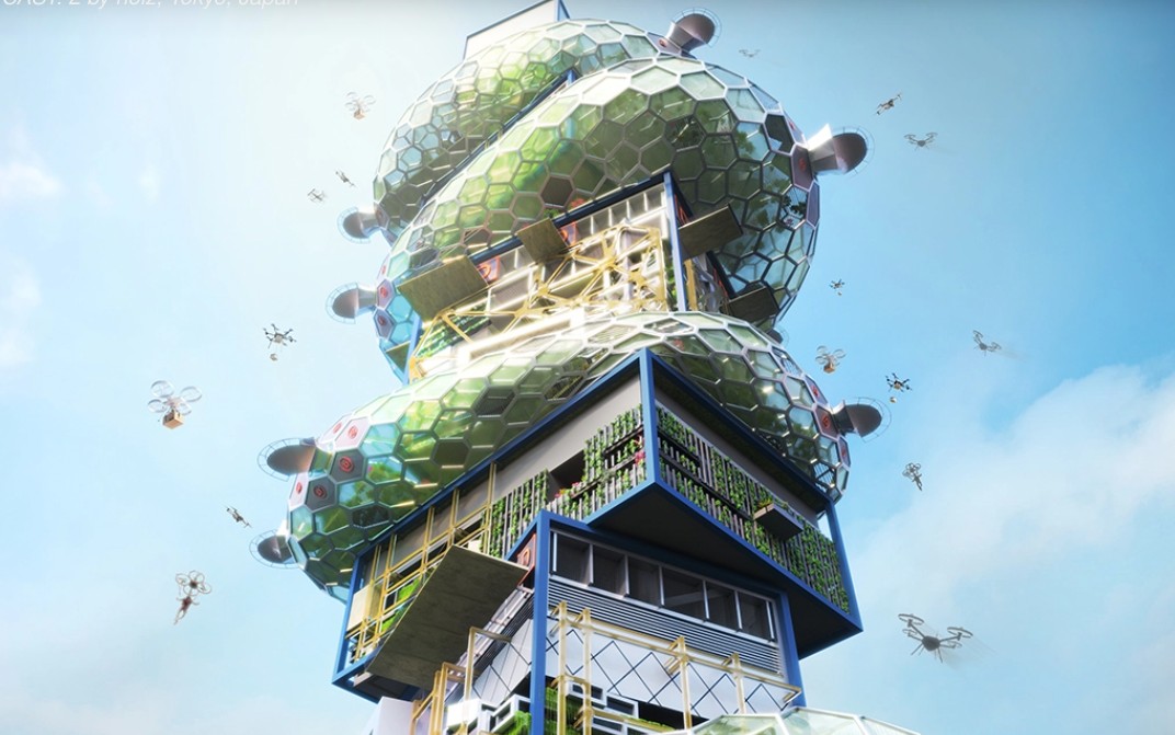 Shibuya Hipercast. 2 by noiz, Tokyo, Japonya: Bir fütüristik kule mevcut konumunun en iyi yönlerini getiriyor. Her biri farklı bir bölgeyi temsil eden beş bölüme ayrılmış. Bu bloklar tüm yıl boyunca gıda üretimi için kullanılabilecek köpüklü yeşil bölgelerle ayrılıyor. Kule aynı zamanda insan asansörlerini, drone şaftlarını ve dijital temsilci asansörlerini aynı bina içinde kullanarak teknolojiyi ve insan faaliyetlerini entegre etmeyi hedefliyor. Şirket daha iyi bir yaşam kalitesi sağlamak için planlarına misafirperverlik ve sağlıklı yaşam özelliklerini de ekledi.