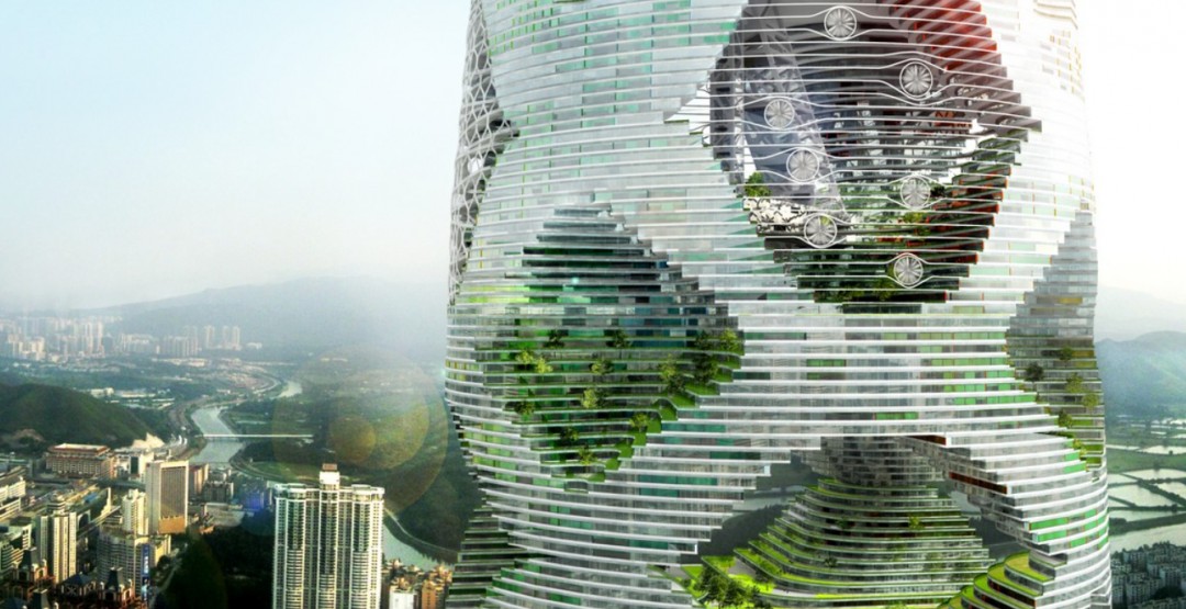 Shenzhen Lojistik Şehri ve JDS Architects: JDS Architects, yeşil alanın binanın merkezinde olmasını istedi. Bunu yeşil peyzajı kulenin içine dahil ederek başardılar. Bu yeşil katmanlar bina boyunca dağ benzeri bir düzende devam ediyor. Konturlu dış büyük kesikler, ışığın ve havalandırmanın çekirdeğe ulaşmasını sağlıyor. Kentsel müdahaleler, rüzgar enerjisi üretmek ve kendi kendini idame ettirmek için bu boşluklarda büyük türbinlere sahiptir.