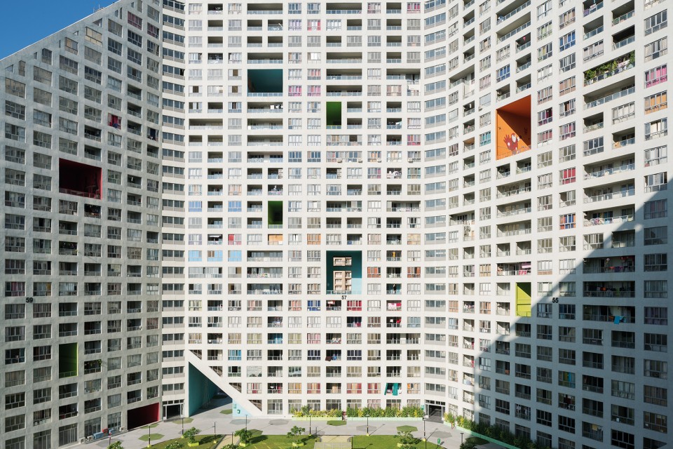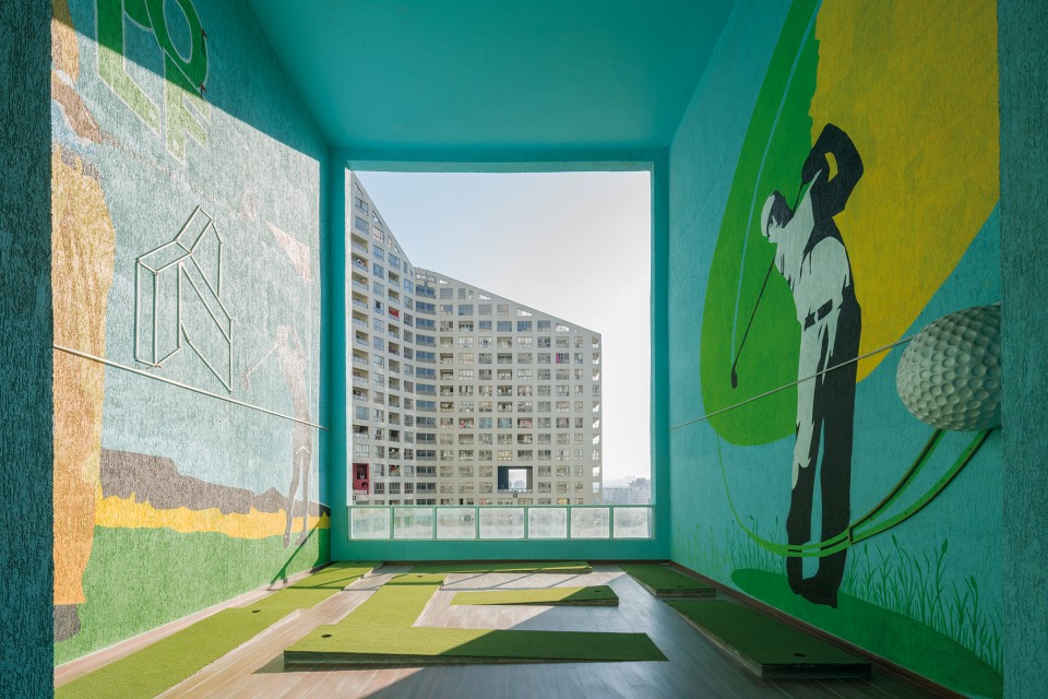 Avlular birbirine dört kat yüksekliğindeki üçgen kapılarla bağlanmış. Yapıya farklı bir kimlik kazandıran, binanın koridorları ile birbirine bağlanan bu renkli açıklıklar her ne kadar yangın yönetmeliğine uyulması amacıyla tasarlansa da, asli görevi kamusal alanlar yaratmak olmuş. Yoga, mini golf yada çocuk oyun alanı olarak fonksiyon kazanan bu açıklıklar, ortak kullanım alanı olarak komşuluk ilişkilerine de katkı sağlamakta.