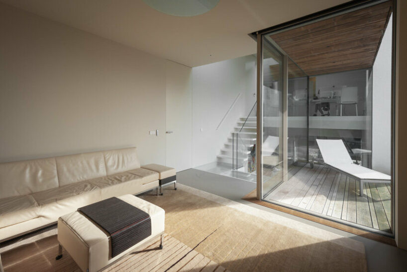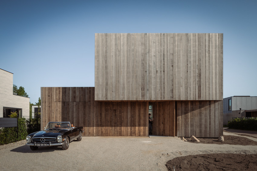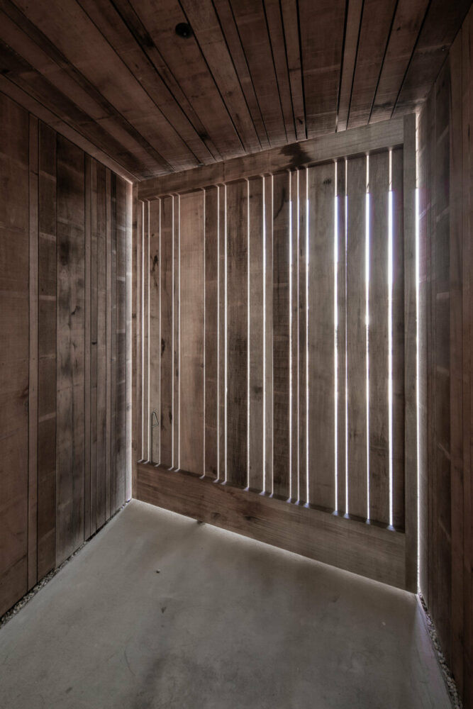 Büyük bir döner kapı, kapatıldığında cepheyle birleşerek giriş alanında bir mahremiyet ve yapısal sınırlama hissi sunuyor. Merkezi bir merdiven ve bitişik dış mekanlar villanın çeşitli katlarının manzarasını sunar. Tasarım ekibi, iç ve dış mekanlar arasında akıcı geçişler sağlamak için pencere çerçevelerini kaplama ve sıva işlerinin arkasına gizleyerek özenli detaylara dikkat ediyor. Ahşap cepheler çatı kenarlarını örtüyor ve geri çekilmiş pencerelerle zarif bir şekilde harmanlanarak ana şekli yukarıdan zemin seviyesine kadar uzatıyor. Pervazsız ve eşiksiz tavandan tabana pencereler, duvarlarla bütünleşerek iç mekana dahil edilmiş.