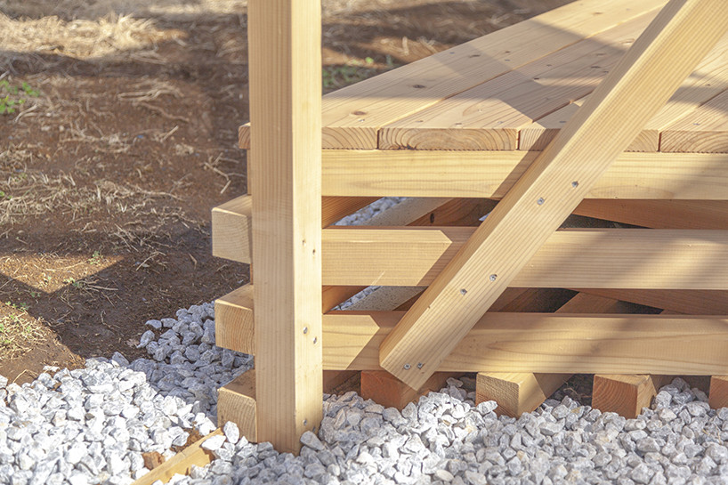 Hafif, geçici yapıların zorluklarının üstesinden gelmek ve Japonya'nın güçlü rüzgarlarına ve tayfunlarına dayanmak için, çakıl taşlarıyla dolu torbalardan oluşan bir temel, bankların altına gizlice yerleştirildi ve pavyon çerçevelerine güvenli bir şekilde bağlandı. Bu yaklaşım, ekibin maliyetli temel çalışmalarından kaçınmasını sağlarken, yapının gelecekte sökülmesini de kolaylaştırdı. Yerel Japon sediri (sugi) ahşabı da dahil olmak üzere doğrama ve malzemeler, kolay geri dönüştürülebilmeleri ve yeniden kullanılabilmeleri için seçilirken, ahşabın boyutları ve hafifliği, her parçanın bir veya iki kişi tarafından kolayca taşınabilmesini sağladı.