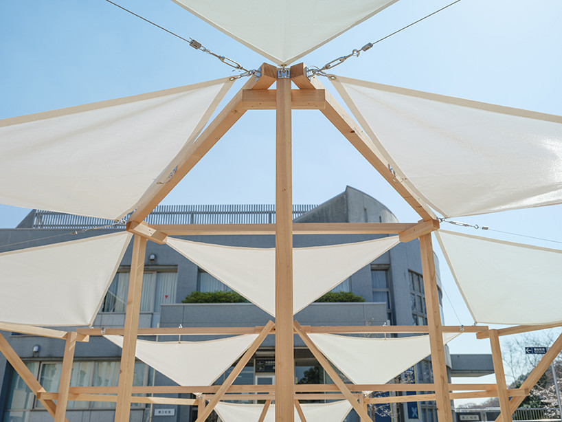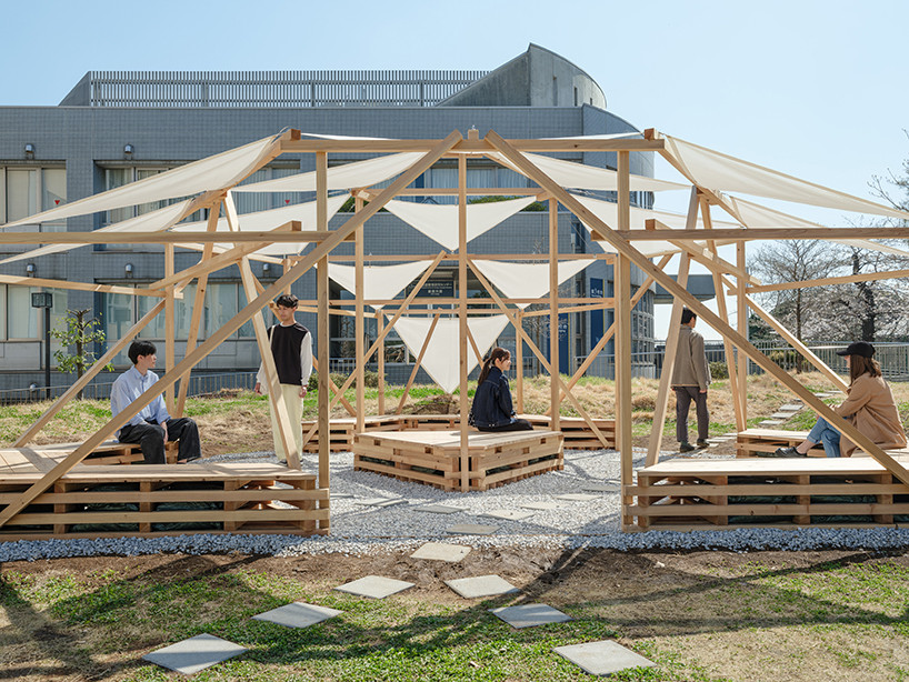 Jorge Alamazán ve Keio Üniversitesi Studiolab'ın Hiyoshi Pavilion'u boş bir alanı öğrencilerin takıldığı bir mekâna dönüştürüyor. Geçici ahşap yapı, zihinsel sağlığı ve akademik performansı artırmak için Japonya'nın Yokohama kentindeki üniversite kampüsünde sosyal karşılaşmaları teşvik ediyor. Öğrencilerin kendileri tarafından inşa edilen yapı, ağır makine ya da özel bir inşaat gerektirmeyen basit bir strüktürden oluşuyor ve kareli bir şekilde düzenlenmiş üçgen örgü kumaşlara tutturulmuş ahşap çerçevelerle kaplı dört banktan oluşuyor. Dokumalar yumuşak gölgeler oluşturmakta ve aşırı basınçtan kaçınarak rüzgarın hafifçe geçmesine izin veriyor.