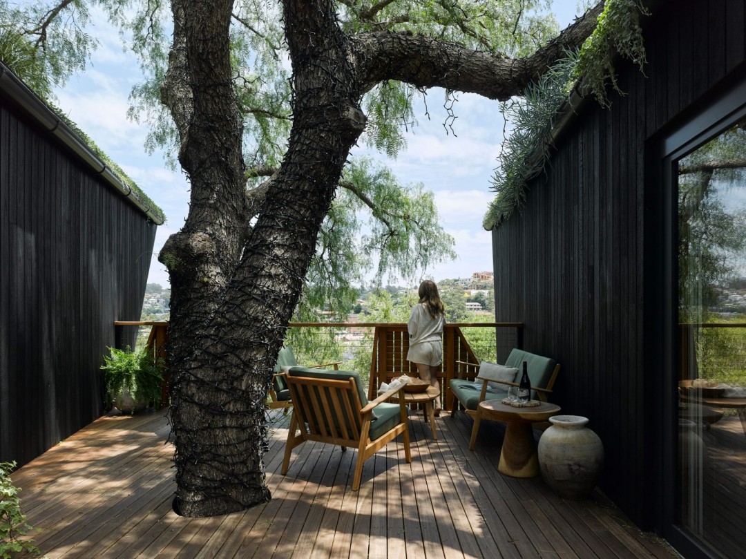 Yeni konaklama birimi, merkezi bir terasa açılan 60 yıllık bir biber ağacının çevrelediği iki kanattan oluşuyor. Bina dik bir yamaçta yapılmış ve ağaçların tepesine yükseliyor. Mimar mevcut çevrenin bozulmasını sınırlayarak ve doğayı restore eden peyzaj tasarımlarını birleştirerek sitenin biyolojik çeşitliliğini koruyor. Binanın iki kanadı kuraklığa dayanıklı yerli türlerle dikilmiş yeşillikle kaplıdır. Çatı bahçeleri konutta kullanılan fazla yağmur suyunun toplanmasına yardımcı oluyor. Bu proje ağaçla bağlantıyı güçlendirmek için mümkün olan her yerde doğal malzemeler kullanıyor. Dış kaplama, dayanıklı ve su geçirmez bir dış yüzey oluşturmak için ahşabı kömürleştiren Japon "çam sedir tahtası tekniği" kullanılarak tamamlandı.