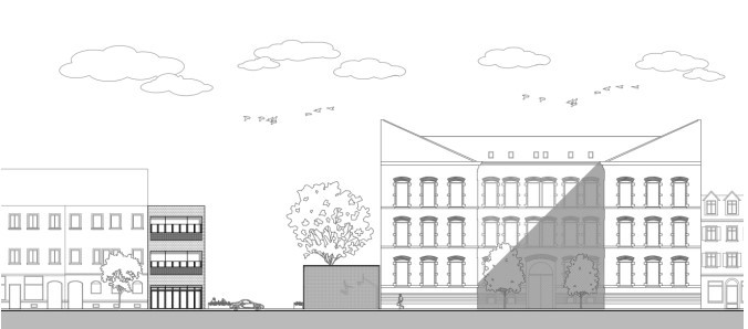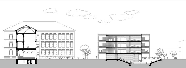 Yeni okulun plandaki formunun belirlenmesinde ise eski okul binasının planını referans alarak tasarımda form yönünden de bir süreklilik sağlamaya çalıştım. Bu bütünleştirme fikrini, cephede kullanılan malzemeler ile yapı bileşeni seviyesine kadar taşıdım.