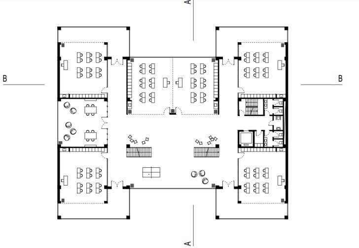 Tüm bunlara ilave olarak yeni yaptığım binanın zemin katındaki kafe, mevcut yemekhane ve kapalı spor salonunu içeriden birbirlerine bağlayarak, işlevsel yönden bütüncül bir çözüm sağladım. Bu şekilde yemekhaneyi de öne doğru büyütmüş ve yeni ihtiyaçlara uygun hale getirmiş oldum.
