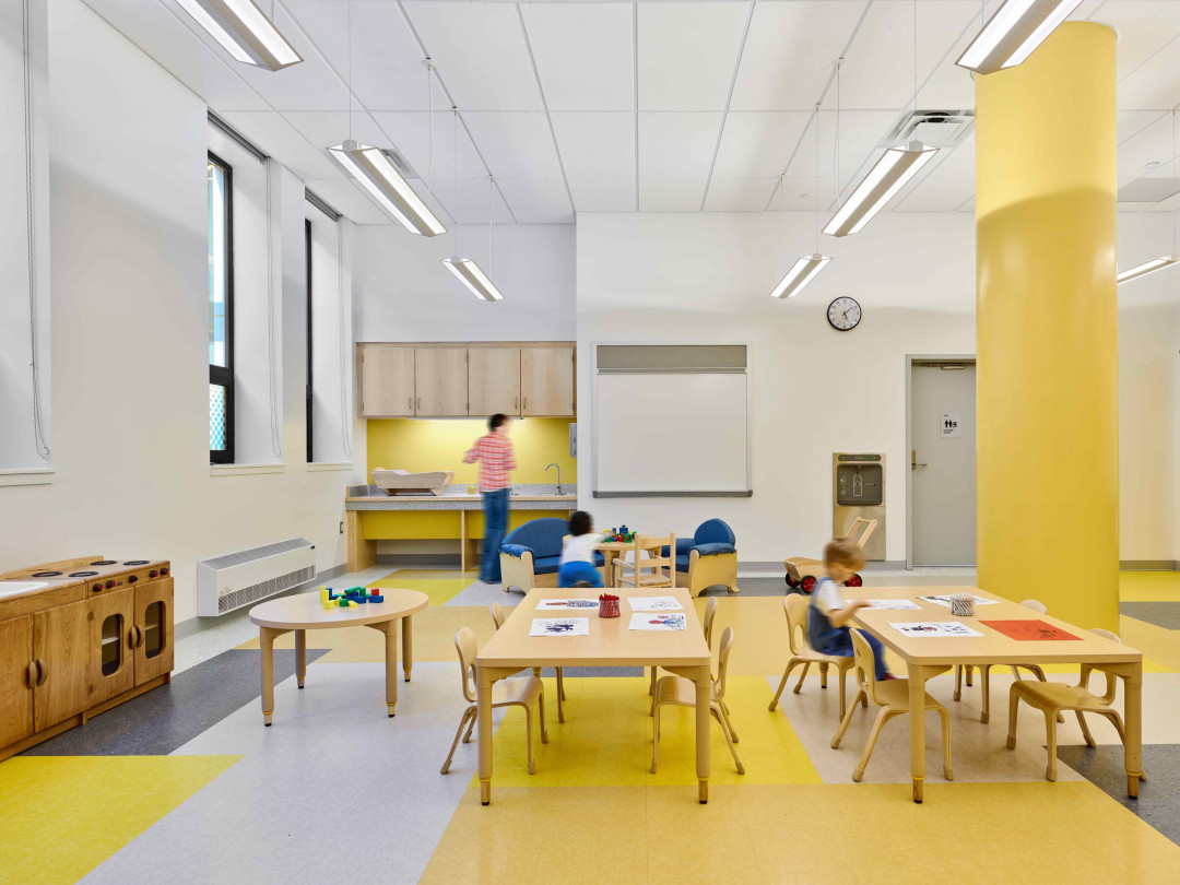 Anaokulu, Circular tarafından "New York Şehri Okul İnşaat Kurumu'nun Hızlı 3K Kapasite Programı" kapsamında oluşturulmuş. (Bu program, devlet okullarında 3 yaşındaki çocuklar için ücretsiz yer sağlayarak yüksek kaliteli erken çocukluk eğitimine erişimi genişletmeyi amaçlıyor. Talebi karşılamak için mevcut ya da inşaat halindeki binalar okul olarak kullanılmak üzere yeniden tasarlanır). Projeyi gerçekleştirmek ve zorlu okul standartlarını ve gelişmiş enerji performansı hedeflerini karşılamak için Circular, cephe, çekirdek ve iç düzenleri güncelleyerek kısmen inşa edilmiş bir ticari binayı hızla uyarladı: Stüdyo, "Hızlandırılmış program zaman çizelgeleri, proje devri için 15 aylık bir programı karşılamak amacıyla tasarım ve mühendisliğin tamamlanması için yalnızca 90 güne izin veriyor." dedi. Binanın uyarlanarak yeniden kullanılması, yapının ve dolgu malzemelerinin çoğunu korudu, böylece atıkları azalttı ve projenin kısıtlı teslim tarihini karşılamaya yardımcı oldu.