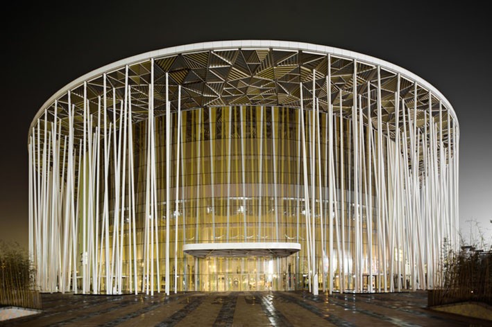 Çin'in Guangzhou kentinin Huadu Bölgesinde bulunan “Sunac Guangzhou Grand Theatre”, Londra merkezli SCA|Steven Chilton Architects tarafından tasarlanan, yakın zamanda tamamlanmış 2000 kişilik özel yapım tiyatrodur. Guangzhou, “Denizdeki İpek Yolu'nun” doğum yeridir. Bu yol Han Hanedanlığı'ndan bu yana sanat ve ticaret için önemli bir merkez olmuştur. Geleneksel ve çağdaş sanatçılarından ilham alan tiyatro konsepti, sanatçı Zhang Hongfei'nin çizimleriyle beraber ipek nakışlarla şekillendirilmiştir.