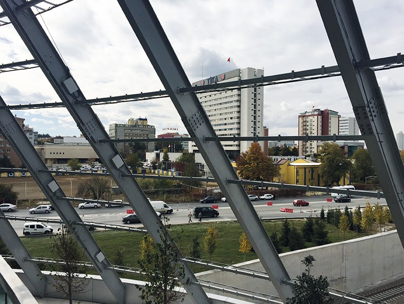Projenin cephe ve kabuk tasarımındaki diğer bir etken de Celal Bayar Bulvarı’ na yani güneybatı yönüne bakan ve düşeyde eğimli olarak tasarlanan büyük cam cepheyi taşıyan çelik strüktürün üstte devam ederek çatıyı taşıyan strüktür haline gelmesidir.