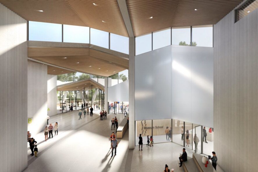 Esnek bir atriyuma benzetilen, hafifçe kıvrılan eksen, sergi, eğitim ve performans alanları dahil olmak üzere ana programlama alanlarına ayrılıyor. Daha büyük kamusal alanlar, kuzeyde bir lobi ve 5.000 metrekarelik, camla çevrili bir sosyal alan ve güneyde MacArthur Parkı'na bakan ışıkla dolu bir avlu ile gövdeyi ayırıyor.