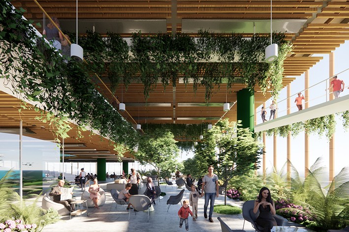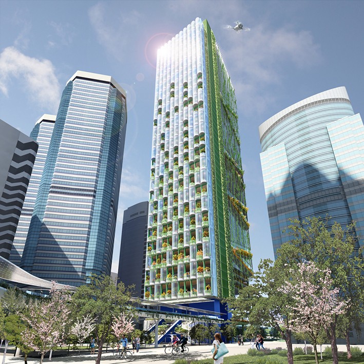 Kulenin ofis katları, yerel atriyumlar ve merkez dışı çekirdekler tarafından delinirken, işbirlikçi alanlar işyerlerini farklı seviyelerde birbirine bağlar. Bina neredeyse tamamen doğal olarak havalandırılıyor ve sağlıklı bir çalışma ortamı sağlıyor. Hava hareketine otomatik hava indüksiyonu da yardımcı olur ve AI kontrollü Akıllı Zarf sistemi havayı filtreler, mikro iklimi ayarlar. Doğu ve batı cephelerinde, otomatik olarak çalıştırılabilen pencereler, üst seviyelerde PV ekranlar ve geri dönüştürülmüş plastik şişelerden yapılmış 3D baskılı gölgelendirme elemanları bulunuyor. Güney cephesi, toplantı alanlarını, kafeleri ve diğer benzer kolaylıkları barındıracak kavisli PV'lerle kaplı bir dizi boru şeklinde modüler ünite içerir.