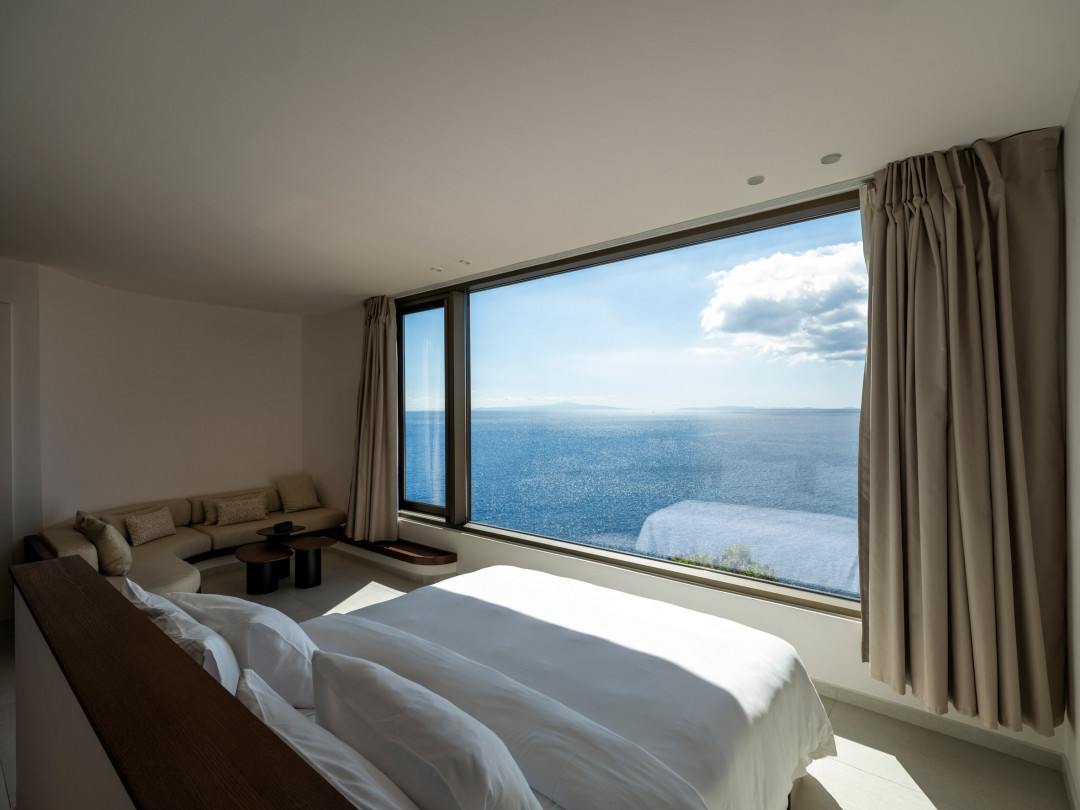 Odaların her biri birbirinden farklı ama denizle iç içe kurgulanmış. Devasa camlar yatağınızla suda süzülüyormuşsunuz hissini destekler nitelikte. Yerel taş, beton ve doğal dokuların birlikte kullanıldığı mimari dil, yapının çevresiyle görsel ve fiziksel bağ kurmasını sağlıyor. Konaklama mimarisinde manzara odaklı yaklaşımıyla göze dokunan proje, topografya ile bütünleşen sakin ve ölçülü bir mekânsal kurgu üzerinden ele alıyor. Son derece özgün ve organik...