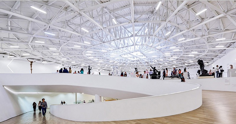 Büyük ölçekli, karışık kullanımlı müzenin girişi geniş ve beyaz bir galeriye açılıyor. Binanın en geniş katı olan en üst katta ise gün ışığının serbestçe içeri girmesine izin veren ve açılabilen askıya alınmış bir çatı yer alıyor. Müze, sanat galerilerine ek olarak, kütüphane, restoran, hediyelik eşya dükkanı ve 350 kişilik bir oditoryum içeriyor.