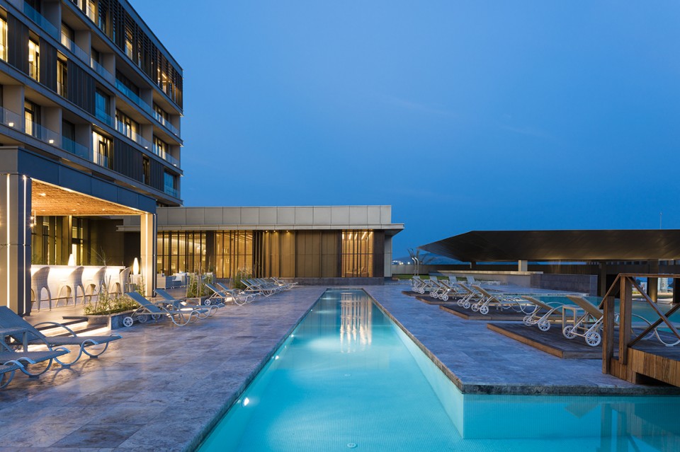 Proje dahilinde Kongo Vadisi boyunca uzanan panoramik manzaralar sunan spa merkezi, restoran, barlar ve havuz konumlandıran Avcı Architects aynı zamanda meydanın uzantısı olarak da işlevlendirdiği yaya bağlantı yollarını, oteldeki havuz başından sıra sütunlara bağlanan alttaki ana etkinlik avlusuna doğru uzanacak şekilde kurgulamış.