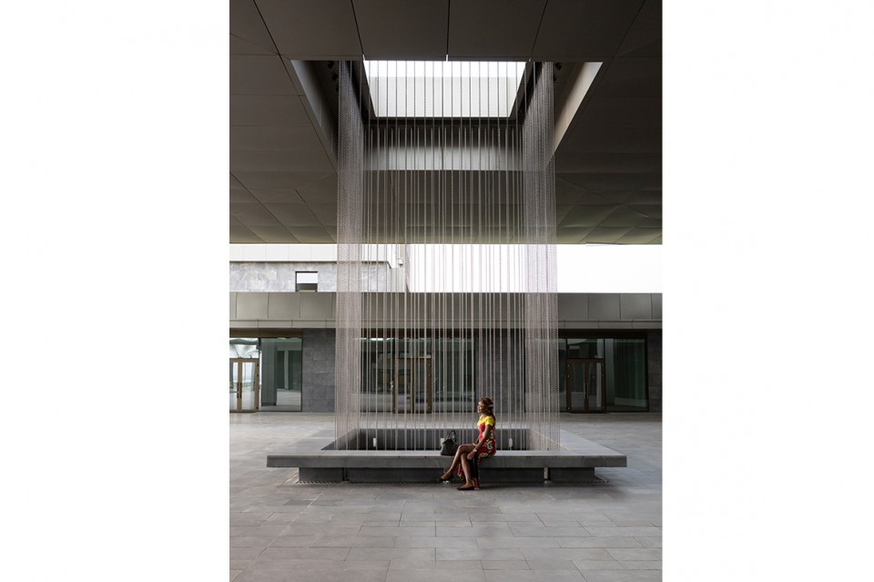 Kintele Kongre Merkezi’nin, bütün araziye hükmeden aşırı büyük bir yapı kütlesi izlenimi yaratmadan, sanki çevrenin kendi parçasıymış gibi ortamla uyumlu bir görünüme kavuşması amacıyla bir sıra halinde konumlandırılmış büyük kütleli, iki tanesi hariç hepsi halka açık olan fonksiyonlar arasında peyzajlı ara bölümler oluşturan Avcı Architects, Kintele Kongre Oteli’ni bu kütlelerden beş metre daha yukarıda konumlandırarak hem daha iyi bir nehir manzarası sağlamış hem de alanın kamusal ile özel işleve sahip kısımlarının birbirinden ayrılmasını amaçlamış.