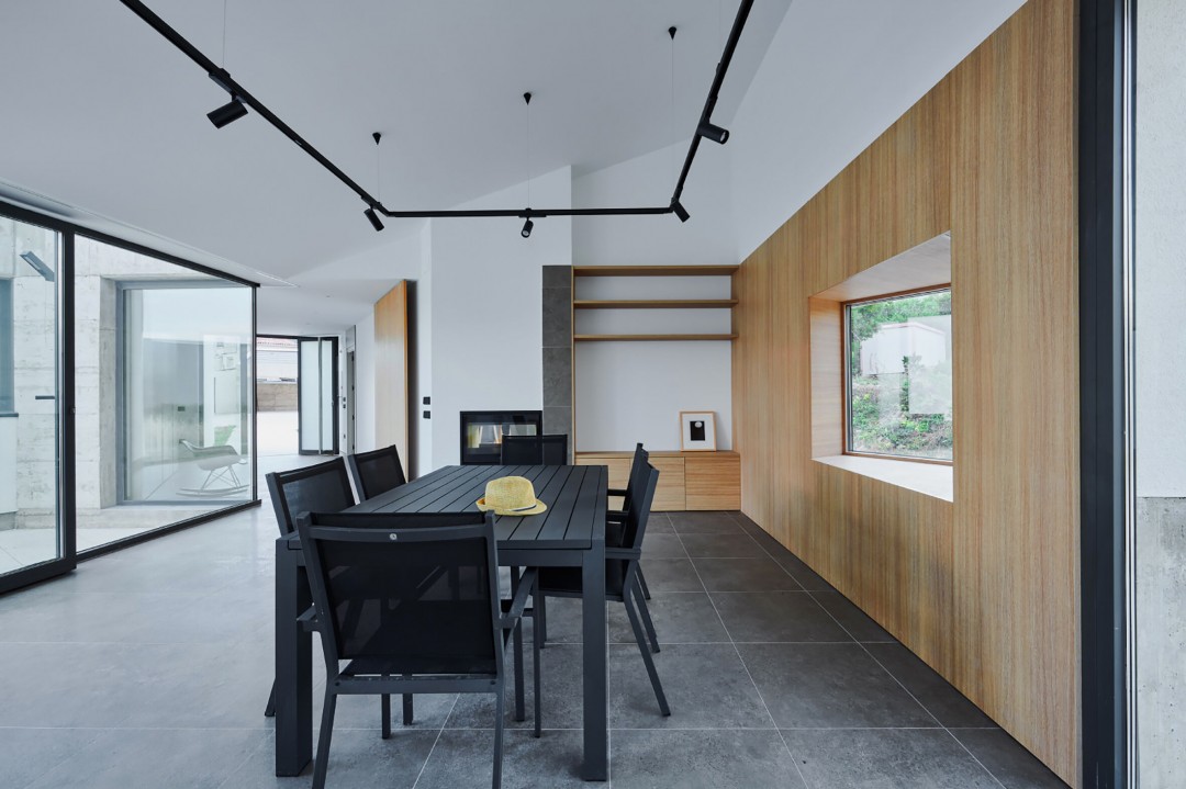 Villa EA'nın yalın ve minimal iç alanında modern mobilyalar, ahşap kaplı duvarlar ve seramik üreticisi Gres Aragón'un yer karoları bulunuyor.