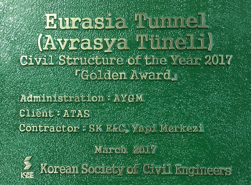 İstanbul’da hızlı, konforlu ve güvenli ulaşım açısından en önemli alternatif olarak öne çıkan Avrasya Tüneli, Kore’li mühendisler tarafından 2017 yılının yapısı seçildi. Kore İnşaat Mühendisleri Derneği (KSCE – Korean Society of Civil Engineers) “Altın Kategori”de 2017 “Yılın Yapı Ödülü”ne Avrasya Tüneli’ni layık gördü.