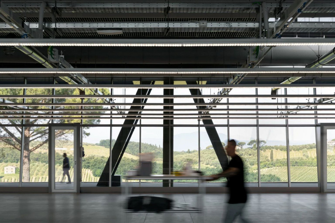 Moda endüstrisinin sürdürülebilirlik tartışması çoğu zaman malzemeler üzerinden yürüse de üretimin gerçekleştiği mekânlar da en az kullanılan kumaşlar kadar kritik. İtalya’da dönüştürülen bu endüstriyel yapı, üretim mimarisinin karbon azaltım stratejilerinin parçası haline nasıl gelebileceğini gösteren güçlü bir örnek. Proje, yeni bir fabrika inşa etmek yerine mevcut bir deri üretim tesisinin yeniden yorumlanmasına dayanıyor ki bu çok etkileyici. Yapının taşıyıcı sistemi korunarak gerçekleştirilen dönüşüm, mimarlıkta giderek daha fazla önem kazanan “gömülü karbonu koruma” yaklaşımını merkezine alıyor. Mevcut beton ve çelik strüktür korunurken, yeni eklenen elemanlar minimum malzeme kullanımı ve sökülebilirlik prensibiyle tasarlanmış.