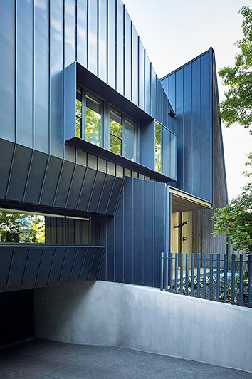 Mahallenin geri kalanıyla uyumlu bir görünüm sağlanması adına çevredeki eski yapılardan unsurlar tasarıma eklendi. Böylelikle geleneksel bir bacanın modern bir yapıda kullanımının çok şık bir örneği ortaya çıkmış oldu. Ayrıca kullanılan sivri çatı ve girişteki sundurma da aynı şekilde geleneksel banliyö evlerinden esinlenildi.