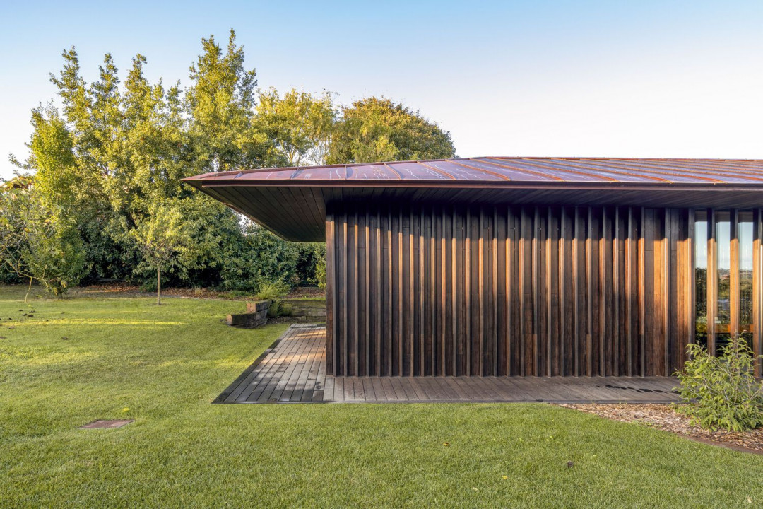 Japon kültüründen esinlenen pavyon, çeşitli alanları birleştiren ve mevcut ev ile yeni yapı arasında bir bağlantı kuran büyük bir çatıya sahip olarak peyzajla sorunsuz bir şekilde bütünleşiyor. Sürdürülebilir mimari örneklerden tasarım, Japon felsefesindeki beş elementi temsil eden 'GODAI' konseptini benimsiyor: toprak, su, ateş, rüzgar ve boşluk.