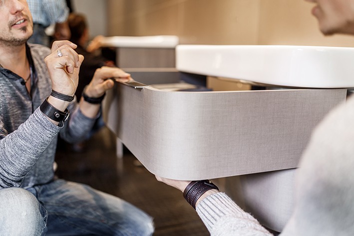 Banyolarda bulunan ahşap yer kaplamaları nostaljik anılara gönderme yapıyor. Bu etki, masif meşe ve ceviz ile aynı anda doğal ve şık olan Christian Werner’in L-Cube serisi ile doruk noktalara çıkıyor. Alternatif olarak, boyalı yeşim renkli yüzeyi ile birlikte, yaz hissi yeniden, banyoda çok özel bir atmosfer yaratıyor. Açık renkli, hatta beyaz parkeler ile tahta zeminlerde tatil hissine etkileyici ve son bir dokunuş ekleniyor.