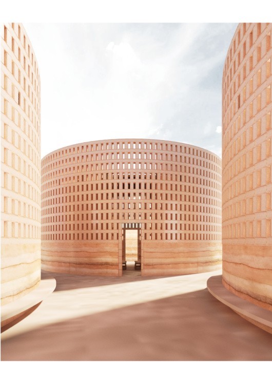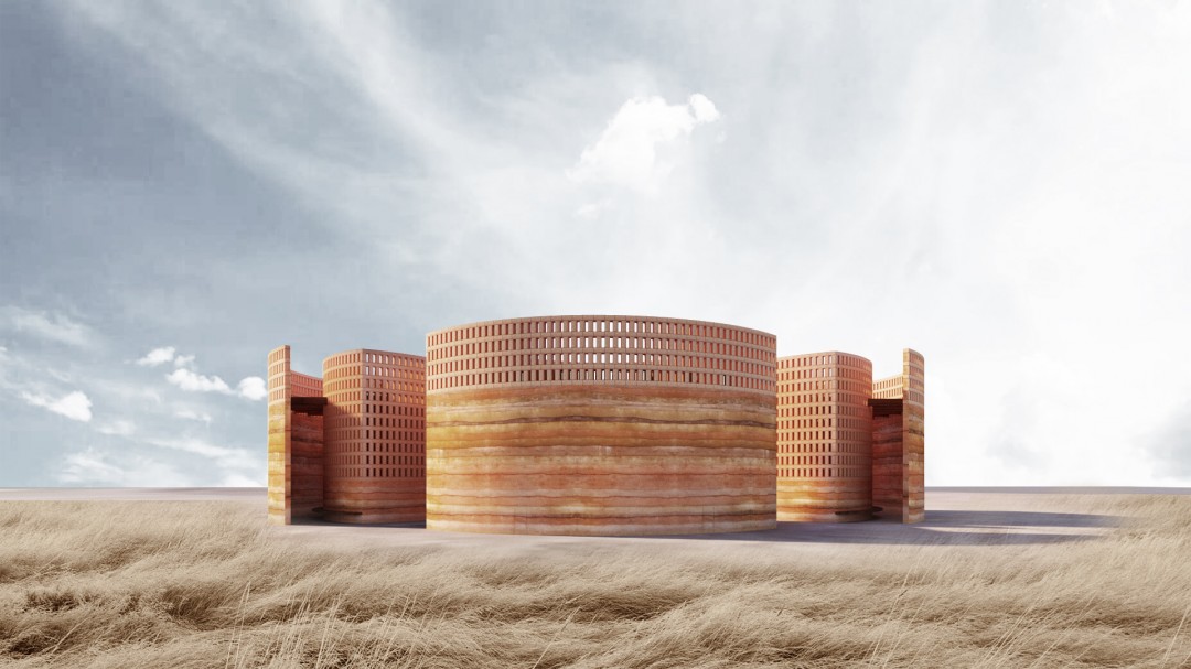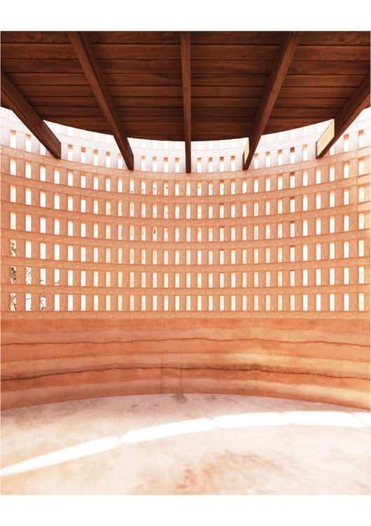 Rüzgar ve ışığın yapıdan geçmesine izin vermek için her bir tabanın üzerinde bir tuğla duvar var. Dış ve iç duvarların hepsi aynı boyutta ve yapıda standart duvarcılık teknikleri kullanılmış. Sıkıştırılmış toprak duvarların inşası, her duvarın şekli ve boyutları için bir şablon görevi gören geçici bir ahşap kalıp ile yapılmış. Kavisli duvarlar sabit kalmaları için ahşap veya çelik kirişlerle birbirine bağlanmış. Kirişler ayrıca dört binanın ahşap çatılarını da destekliyor. Çatı her bir kapalı alanın etrafında bir ışık kuyusu oluşturarak ışığın içeri süzülmesini sağlıyor. Sergi salonları sürgülü ahşap bir kapı ile ayrılabilirken düşünme alanlarına geçitlerle erişilebiliyor.