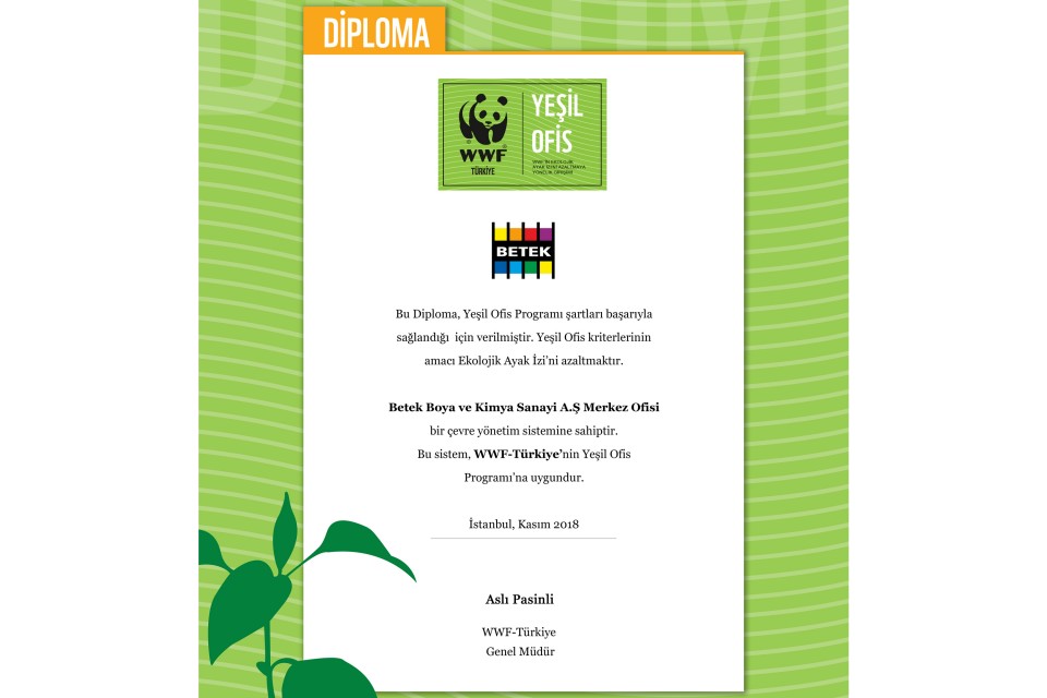 Betek, WWF-Türkiye işbirliği ile 2018 yılı itibariyle başlattığı tasarruf ve iyileştirme çalışmaları sonucunda Yeşil Ofis Diploması’nı alarak, sektörde bu diplomayı alan ilk kuruluş oldu.