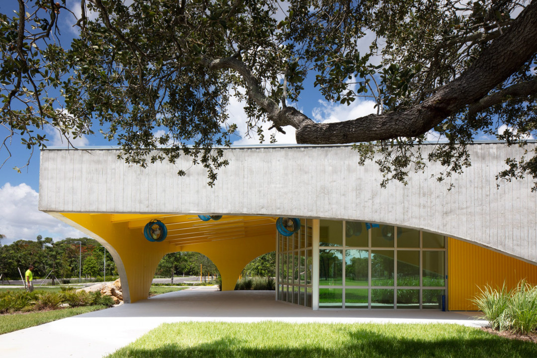 Brooks + Scarpa tarafından "eğlenceli ve heykelsi" olarak tanımlanan kabuk, zemin bağlantıları arasında oluşturulan büyük açıklıklarla noktalarda zemine doğru eğiliyor. Kabuğun çatısı, Fort Lauderdale'in kuzeyinde yer alan Pompano Beach'teki yoğun yağışlardan faydalanmak amacıyla, suyun oluklarla bitişikteki bir yağmur bahçesine akıtıldığı merkezi bir noktaya doğru hafifçe alçalır.