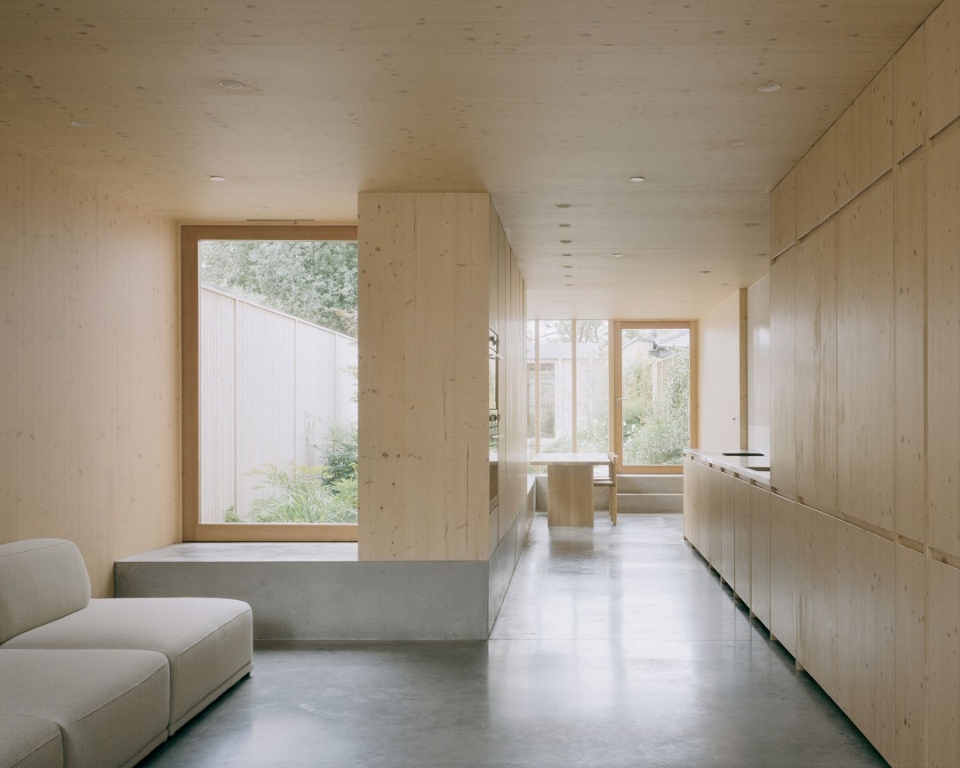 Sürdürülebilir mimari örneklerden konut bir zamanlar köyün ana caddesi olan, eski bir muhafaza alanında yer alan geniş bir arsada konumlanmış. Geçtiğimiz yüzyıl süresince perakende kullanımlardan konutlara dönüşen çeşitli yapı tarzları ile komşu. Bu geçiş sürecinin farkında olan ao-ft, zemin kat boyunca yayılan camlar ve bir dizi dikey ahşap çıta ve pervazla kırılan geniş hacim ile bölgenin özgün dükkan cephesi modeline modern bir şekilde atıfta bulunmayı amaçlamış. Çıta ve pervazların tekrarlanması cepheye dikey bir ahenk kazandırırken, zemin ve birinci katlar boyunca zıt bir desen paleti sunar. Bunun yanı sıra zemin kattaki özel ahşap çıtalı gizlilik perdeleri, eve fonksiyonel olarak gizlilik sağlarken ilave görsel ilgi de katar.