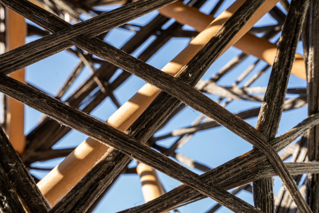 Pavyon, keten lif-polimer kompoziti ile ahşap kullanarak, bu iki malzemenin hibrit sistemdeki avantajlarını sergiliyor. Ayrıca, çevre dostu bir alternatif olarak %56 biyo bazlı malzeme içeren bir epoksi reçinesi kullanarak, mimari ölçekte tamamen biyo bazlı bir doğal lif-polimer kompozitleri ile inşa etme yolunda bir adım atıyor.