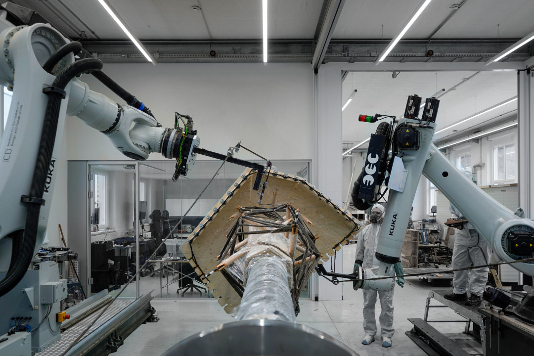 Proje, ahşap ve doğal liflerin tamamlayıcı özelliklerinden yararlanarak, hafif hibrit yapıların tasarımında özgün bir yaklaşım sergiliyor. Ahşabın basınca dayanıklılığı ve esnekliği, doğal liflerin gerilme özellikleri ve çok yönlülüğü ile bir araya gelerek yenilikçi mimari olanaklar sunuyor. ITECH Araştırma Pavyonu, yeni hesaplamalı tasarım yöntemleri ve çoklu robot üretim süreçleriyle hayata geçirildi.