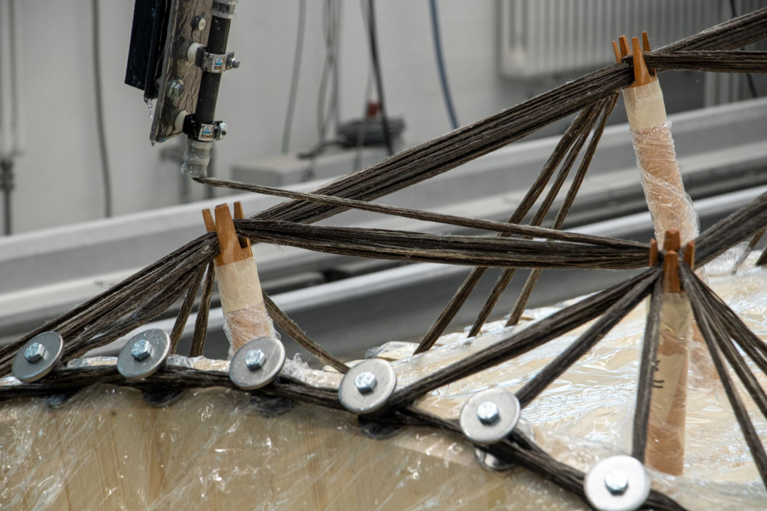 ITECH Araştırma Pavyonu’nun hibrit sistemi, ahşap ve doğal lif-polimer kompozitlerinin birleşiminden kaynaklanan yapısal potansiyelini gözler önün seriyor. Ahşabın hacmi, çatı plakaları şeklinde incelendi ve mekanik ankrajlar etrafında yerleştirilen liflerle bir ara yüz oluşturdu. İki robotun iş birliğiyle gerçekleştirilen bu süreç, yapının mekansal bütünlüğünü koruyarak malzemelerin uyumlu bir şekilde çalışmasını sağlıyor.