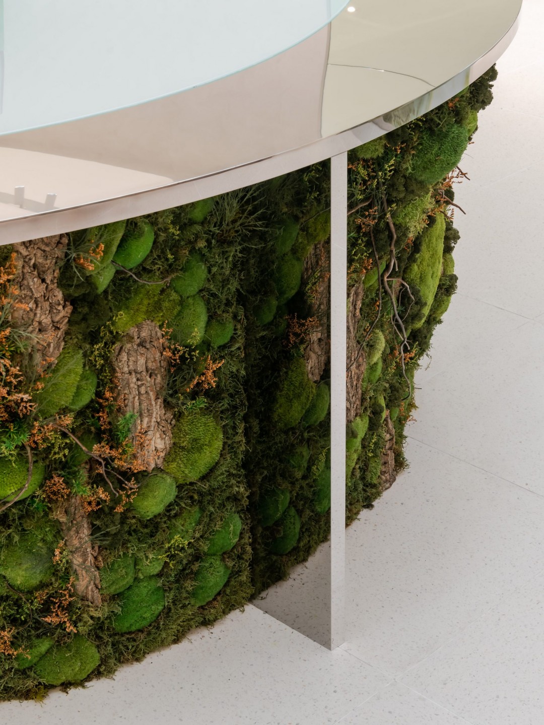 Bu tasarımın merkezinde mağazanın ortasındaki ışıklı bir diskten sarkan, korunmuş düz yosun, top yosunu ve likenle kaplı büyük boy, organik şekilli bir heykel yer alıyor. Kurulumu tamamlamak için aynı bitkilerle kaplanmış yuvarlak bir masa doğrudan aşağıya yerleştirildi. Aynı zamanda mağazada müze objeleri gibi aralıklı olarak sergilenen Braun Buffel deri çantalar için de temel teşkil ediyor.
