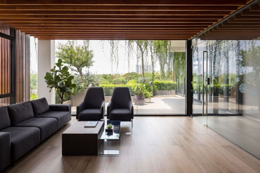 Aslında bitkiler, her ofisten görülebilen yeşilliklerle binanın etrafında koruyucu bir örtü oluşturuyor. Sürdürülebilir mimari tasarımda ahşap çıtalar ise bir küp oluşturarak gerekli gölgeyi sağlar ve cepheyi eğik güneş ışığından koruyor. Pencere camı ayrıca enerji tasarrufu sağlamak için ışığı yansıtır ve ısıyı saptırır.