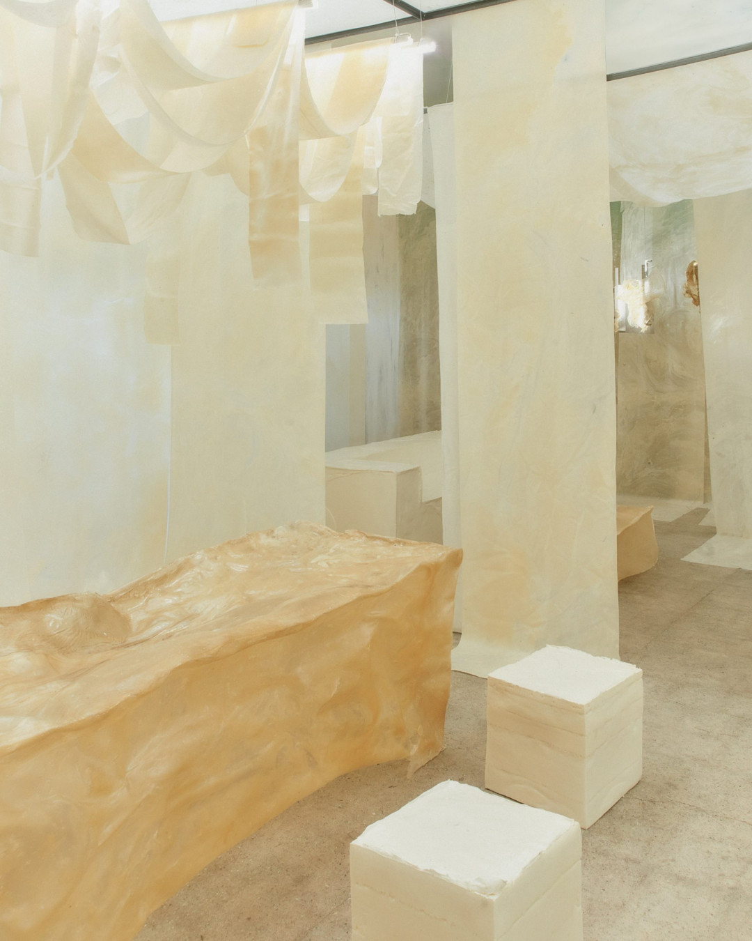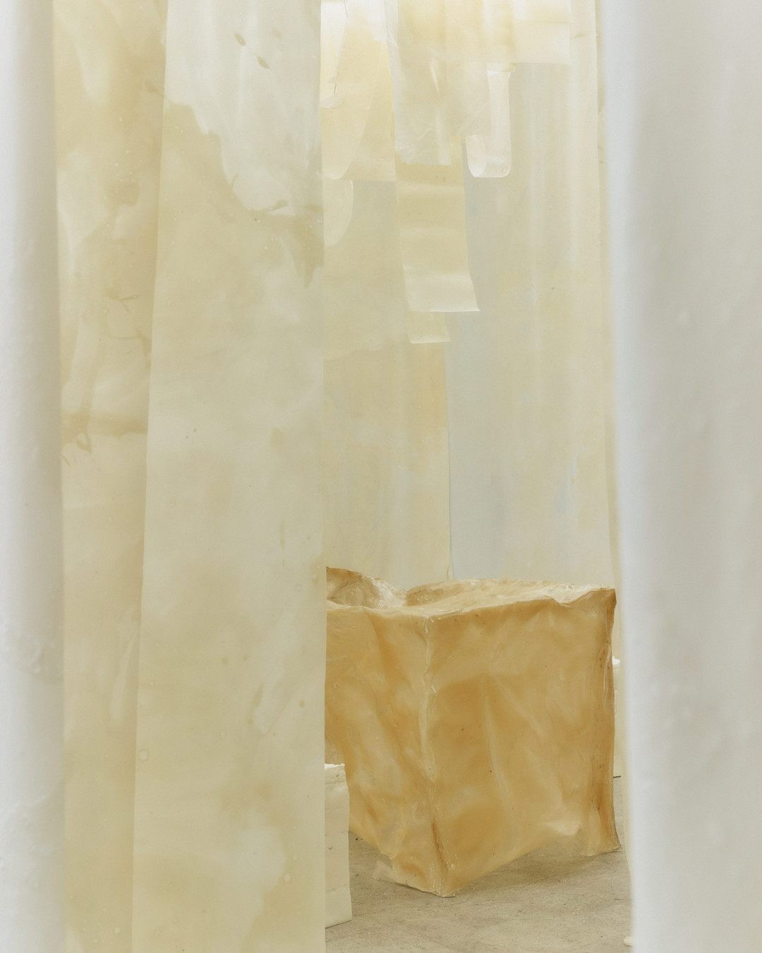 Procel'i oluşturmak için bu doğal protein, mukavemet için az miktarda tebeşir ve esneklik için bitki yağlarından yapılan doğal bir yumuşatıcı ile karıştırılır. Farklı oranlarda birleştirilen ve farklı kalıplara dökülen bu karışım, sadece White Utopia'da bulunan tekstil oda bölücüleri değil, aynı zamanda oturma odası için bütün bir biyo-köpük kanepe, yemek alanı için tabureler ve ziyaretçilerin üzerine oturmaya teşvik edildiği dev bir platform yatak oluşturmak için kullanıldı.