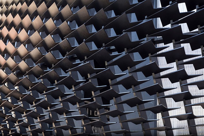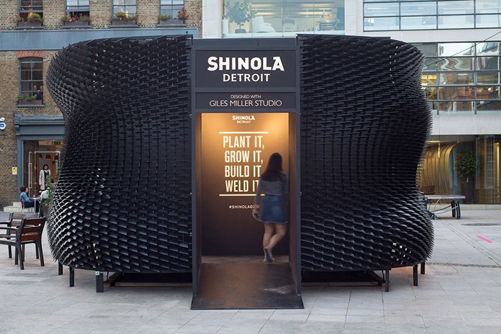 Tüm bina, Shinola motifinin doğrudan bir çevirisi olarak, 8.000 yıldırım şeklindeki kontrplaktan yapılmıştır. Her piksel, şirketin tüm ürünlerinde bulunan üretim doğruluğunu temsil eden Shinola'nın şimşek tasarımından ilham almıştır. Gerçekten de cıvata, zanaatkar yeteneklerine, yüksek kaliteli malzemelere ve uzun ömürlü ürünlere transatlantik bir övgüdür.