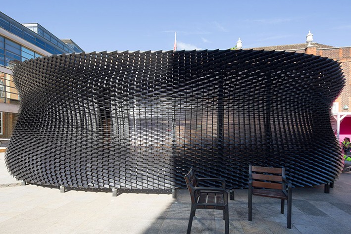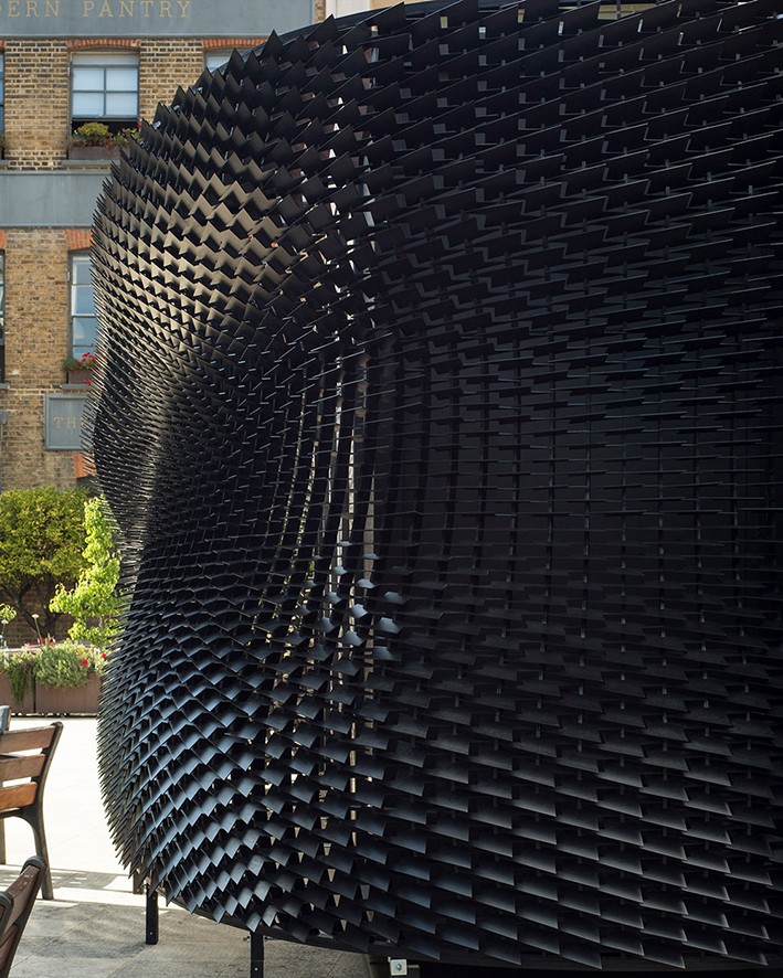 Miller, yapının şeklini atölyelerde bulunan yumuşak deri yığınlarına dayandırıyor. Cut Online tarafından CNC ile kesilen siyah boyalı zona, yapıya elle monte ediliyor. Ardından bu zona, pavyona giren ışık miktarını yönetecek şekilde yönlendiriliyor. Yüzey bileşimi, panjurlu cepheden ışık ve görüşün düzenlenmesine dayalı olarak kontrol ediliyor.