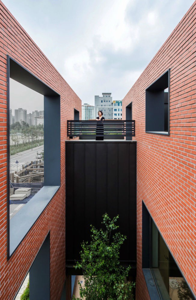 Yemek alanı, mutfak, çocuk odası, yaşlı ebeveynler için oda, yatak odaları, avlular orta boşluktaki sisteme yerleştirilerek diyagonal görünümü oluşturuyor. Cephede kullanılan kızıl tuğla malzemesi aynı zamanda yapısal olarak referans noktasıdır.