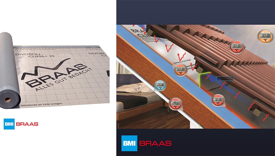 Yapının enerji performansı açısından çok önemli bir alanı olan çatıların, enerji verimliliğini artırmak amacı ile Braas’ın geliştirdiği çözümlerden biri de Divoroll CLIMA+2S. Güçlü bir su yalıtımı örtüsü olmasının yanı sıra reflektif özelliği ile güneşten gelen ısıyı yansıtan ve böylece çatı katında 4,6 dereceye varan sıcaklık düşüşleri sağlayan Divoroll Clima Plus 2S, özellikle yaz aylarında soğutma amaçlı enerji kullanımının azaltılmasına da yardımcı oluyor.