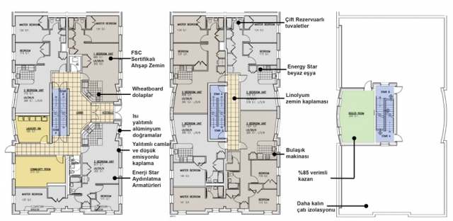 Kullanılan tüm beyaz eşyalar, aydınlatma elemanları, havalandırma ve ısıtma ekipmanları Energy Star standartlarına uygun olarak seçilmiş ve kullanılmış. Energy Star, Amerika Birleşik Devletleri çıkışlı, enerji verimli son kullanıcı ürünlerine verilen, zamanla da diğer birçok ülkenin dâhil olduğu uluslararası bir standart. Bir ürünün Energy Star logosu taşıyabilmesi için, enerjinin verimsiz kullanımından kaynaklanan sera gazı salınımının ve diğer çevreye zararlı maddelerin oluşumunun düşük tutulması ve ürünün hiçbir performans, özellik ve konfor eksikliği içermeden enerji tasarrufu yapabilmesi gerekiyor. Binanın enerji verimliliğini arttırmak için ısı kaybını önleyen mikrofilm kaplı camlar kullanılmış, yüksek verimli, düşük emisyonlu doğramalar düşünülmüş. Isıtma sistemi yüksek verimli tesisatla kurulmuş. Su tüketimi, düşük debili armatürler ile yüksek verimli su tesisatı ile düşürülmüş.