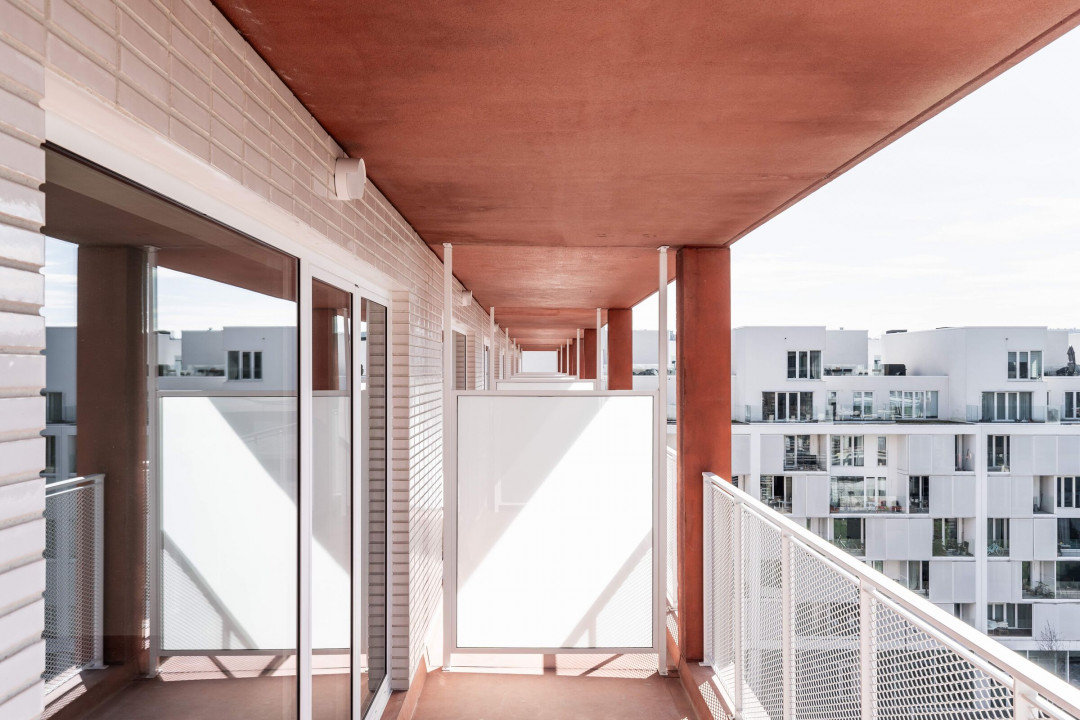 City Dox 7'de yaşam, binanın aktif kullanımını ve sakinler arasında tesadüfi etkileşimleri teşvik eden aydınlık merdiven boşlukları etrafında düzenlenmiş. Tasarım, güneye bakan cephenin tamamen konaklama için kullanılabilir olmasını sağlıyor. Sundurmalı ikincil bir "raf yapısı", dairelerin çoğuna merkez parka bakan geniş açık alanlar sağlar; bu sundurmalar aynı zamanda iç mekanları güneye bakan güneşten korur ve ticari birim sırası boyunca bir revak oluşturur. Yapı, binaya kendine özgü bir çehre kazandırıyor - pişmiş toprak renkli beton, binanın açık renkli tuğlasıyla estetik bir kontrast sağlıyor. Bu pişmiş toprak rengi binanın arka ve yan taraflarında da devam ederek pencereleri ve merdiven boşluklarını süslüyor; sırlı taşla kaplı yüzey blokları da cephelere canlılık katıyor. Çatı bahçesindeki ikinci bir çerçeve Parc de la Petite Ile'ye doğru manzaralar sağlıyor.