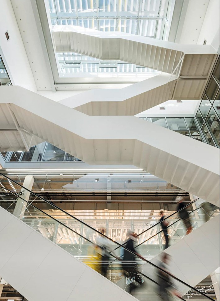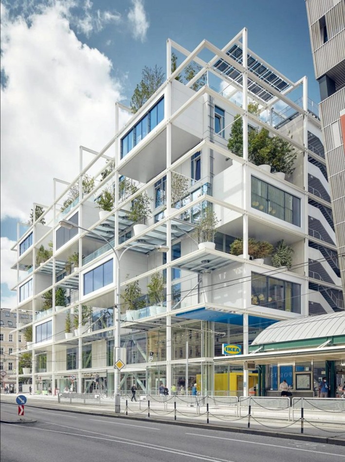Uzaktan- en azından sokağın diğer tarafından- bina devasa bir DIY rafı gibi görünüyor. Ancak bu raflar, kitaplar ve toplanan küçük materyaller için tasarlanmamıştır; bu raf şeklindeki katlar şirketin 3.000'den fazla mobilya ve dekor parçası koleksiyonuna yöneliktir ve bunların tümü yığılmış 32 x 32 fit cam duvarlı bölmeler arasında düzgün bir şekilde organize edilmiştir. Aynı zamanda bu yedi katlı İkea mağazası halka açık bir çatı terasına, bir kafeye, üst iki katta bir pansiyona ve her katta dev boyutlu saksı bitkileri koleksiyonuna ev sahipliği yapıyor. Burada yeşil hayat sadece gösteri için kullanılmıyor.