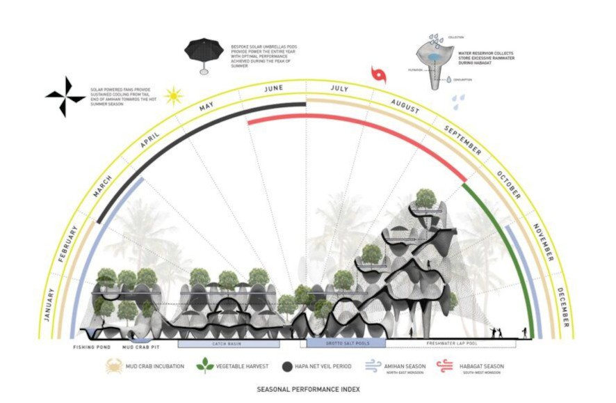 Sakinler ve ziyaretçiler için tasarım, çamur ve yüzme havuzları ile birlikte bir tuzlu su mağarası içerir. Tasarımcılar, çok odaklı tasarım öğelerinin turistlere, özellikle eko-turizme hitap ederken, çeşitli doğal ve topluluk unsurlarından oluşan 7.641 adadan oluşan Filipin kültürünü yaşatmayı umuyorlar.Yapı genelindeki Hapa ağları, ağların tarihi kullanımını yansıtırken hava şartlarına ve böceklere karşı koruma sağlar.