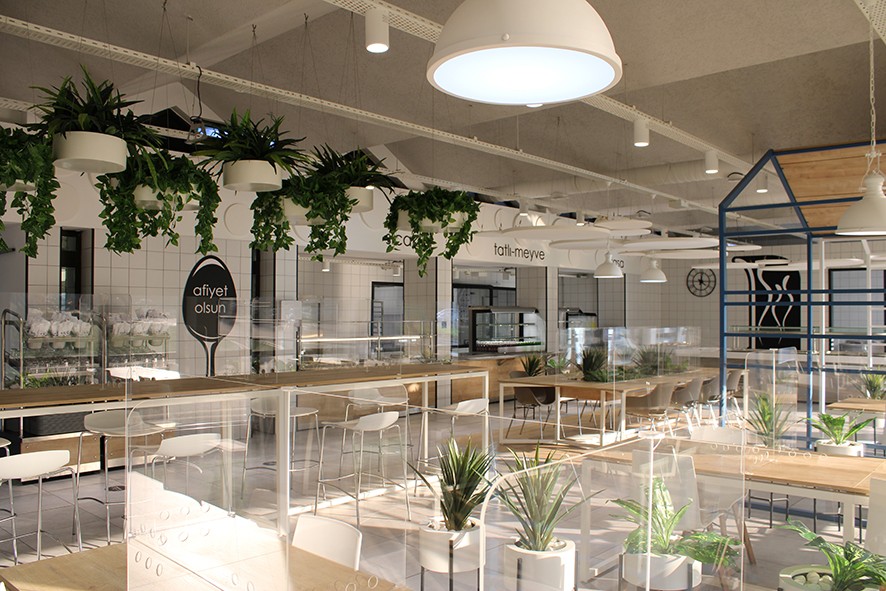 Pandemiyle birlikte mekan kurgusunu oluştururken, kişi sayısını tam kapasite ve pandemi düzenine uygun olacak yerleşimle iki şekilde planladık. Yine masalarda pandemiden dolayı kullanıcıların birbirleriyle olan sosyal mesafesini koruyabilmek için şeffaf bölücüler kullandık, masalardaki kapasiteyi azalttık. Ofis çalışanlarının vakit kaybetmeden, fabrika alanları içerisinde keyifle yemek yiyip, kahvelerini içip çalışma alanlarına dönebilecekleri ferah, aydınlık bir kafeterya-yemekhane alanı tasarladığımızı düşünüyoruz. Kullanıcı yorumlarının da aynı şekilde olması projede planladığımız kurgunun başarılı olduğunu gösteriyor.