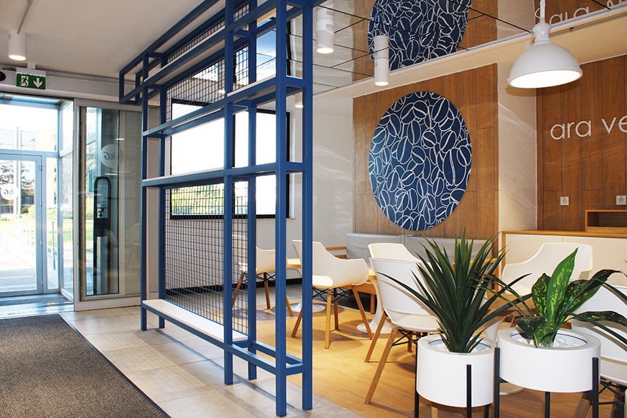 Kullanıcıların kendilerini özel ve rahat bir mekanda hissetmeleri fikrini odak noktamızda tuttuğumuzda, tavanın yüksekliği ve yapısından faydalanarak mekan içerisinde çatı kurgusuyla ilişkili olacak şekilde çeşitli gazebolar tasarladık. Bu gazeboları şeffaf şekilde tasarlayıp, kullanıcıyı hem mekana hakim kılmayı, hem de onlara bir izolasyon sağlamış olmayı hedefledik. Konseptte renklerde daha sakin bir yol çizerken bitkilerin yeşili ve gazebolarda ortaya çıkardığımız mavi renk ile birlikte mekanda bir heyecan yaratmak istedik. Zeminde farklı dokularda malzeme kullanarak, içinde bahçe hissi veren yapay bitki kullandığımız masaları vurgulayarak ön plana çıkardık.