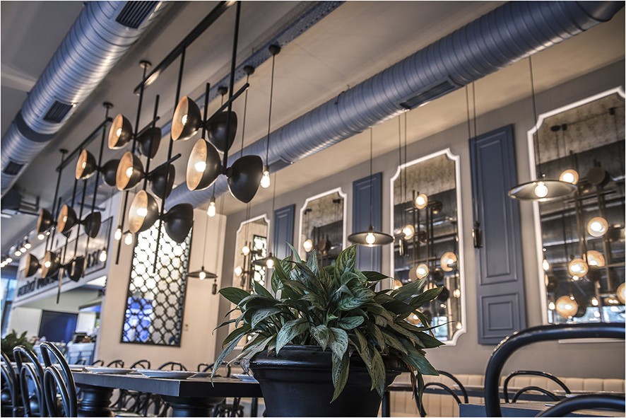 Nostaljik etkinin pekiştirilmesi amacıyla kullanılan sıcak sarı ışık veren özel Edison ampullerin dominantlığına, masaların üzerine sarkıtılan vintage asansör sarkıt aydınlatmalar eşlik ediyor. Duvarlarda ve servis hattında kullanılan çıtalı mavi ahşap paneller dekorasyona adeta fon oluşturarak, mekanı tamamlanmış ve masa yüksekliğindeki özel imalat geometrik motifli taş oyması saksılara bitkilendirme yapılmış.