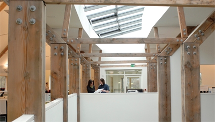 Merkez sokak açıklık hissi vermekle birlikte departmandan departmana görüş olanağı sağlar. Kütüphane ve kafeterya alanları bu merkez bölgeden ayrı bulunur ve çift kat yüksekliğindedir. Ayrıca zemin katta toplantılar, repografik, arşiv ve paylaştırıcı bilgisayar ağı odaları için daha özel odalar bulunur. Birinci kat açık plandır ve tavanın çatı çizgisini takip etmesi bina yüksekliğini artırır. Bina kesiti geleneksel ambar gibi çift eğimli çatıları olan yapıların iskeletini baz alır. Eski genel merkez binasından farklı bir anlayışla tasarlanan bu yeni binada çalışanlar, bu mekanlarda daha üretici olduklarını çünkü daha mutlu ve sağlıklı hissettiklerini belirtiyorlar.