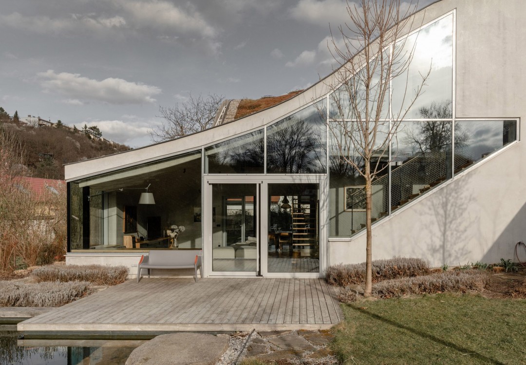 Yerel mimarlık stüdyosu RO_AR tarafından tasarlanan Çek Cumhuriyeti'ndeki bu evi çimlerle kaplı dalgalı beton bir çatı kaplıyor. Prag'ın Hlubocepy bölgesinin kenarındaki bir vahşi yaşam geçidinin yanında yer alan aile evi, "kentsel ve doğal arasında bir köprü" olacak şekilde tasarlanmış. Bunu başarmak için RO_AR, evi "iki geometrinin çarpışması" olarak tasarladı; şehre bakan, ince meşe çıtalarla kaplı doğrusal bir biçim ve bahçeye ve ötesindeki doğal manzaraya bakan tepeye benzer, çim tepeli bir form.