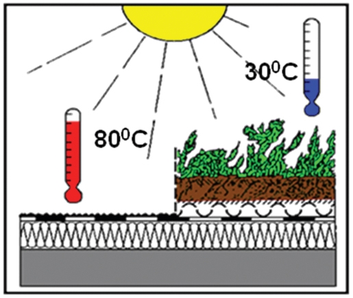 Fotovoltaik paneller verimliliklerine göre güneş enerjisini belirli oranda elektrik enerjisine dönüştürürler. Fakat fotovoltaikler için en büyük sorun, güneş ışınımının aslında en çok olduğu ve en çok faydanın sağlanmasının beklendiği yaz koşullarında, havalandırma eksikliği ve aşırı ısınma nedeniyle verimliliklerinin düşmesi olmaktadır. Ortam sıcaklığı 25°C’ yi geçtiğinde fotovoltaik panellerin verimlilikleri düşmeye başlar. Genel kabul görmüş bir kural olarak: 1°C’ lik ısınma başına %0,5’lik verim kaybı olmaktadır.[2] Bu durum fotovoltaiklerin enerji üretimini yüksek oranlarda düşürmektedir. Yeşil çatı sistemi, çıplak veya çakılla kaplı çatılarla kıyaslandığında, bitki seviyesinde oluşturduğu buharlaşma ile yarattığı soğutma etkisi sayesinde fotovoltaik paneller için istenen sıcaklıklardaki hava koşulunu sağlamaktadır. Ayrıca panellerin altında oluşacak hava akımıyla da aşırı ısınması önlenerek enerji üretimlerindeki verimliliklerinin artması sağlanmaktadır. (Resim 1)[3] Resim 1’de görüldüğü gibi çıplak çatılarda çatı yüzeyi sıcaklığı: 80°C’ ye kadar ulaşabilmektedir. Yeşil çatılarda ise en fazla 35°C olmaktadır. Sıcaklık farkı 45°C’ dir. Dolayısıyla yeşil çatılara kıyasla, çıplak çatılarda kullanılacak fotovoltaik panellerde maksimum %22,5’luk verim kaybı olabilmektedir. [3] Yeşil çatı ve fotovoltaik panel entegre sistemler, genellikle seyrek yeşillendirilmiş çatılarda tercih edilmelidir. Çünkü yoğun yeşillendirilmiş alanlarda yüksek boylu bitkiler panel seviyesine ulaşıp panele gölgeleme etkisi yaparak, verim kaybına neden olmaktadırlar.